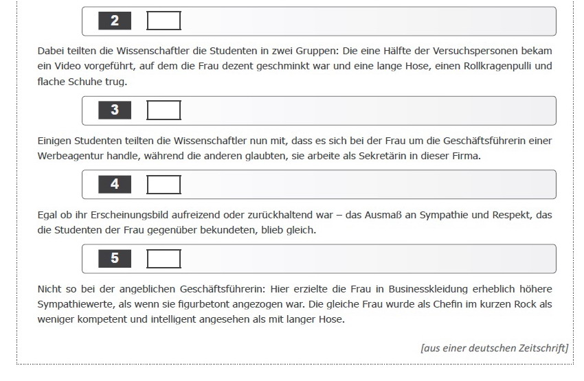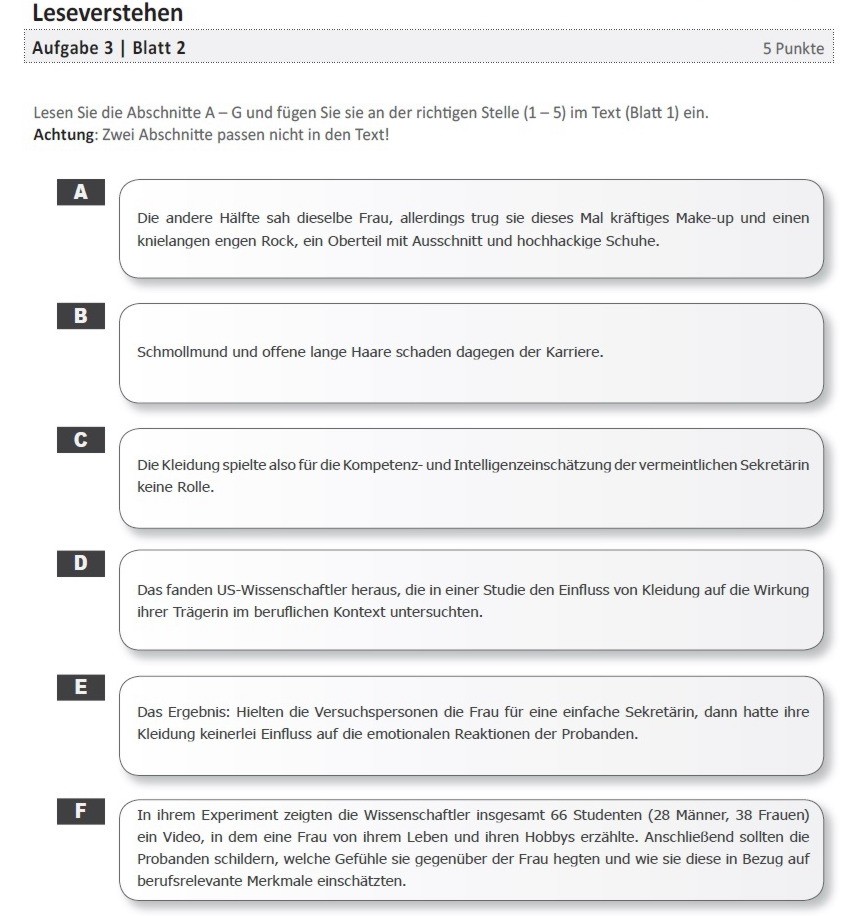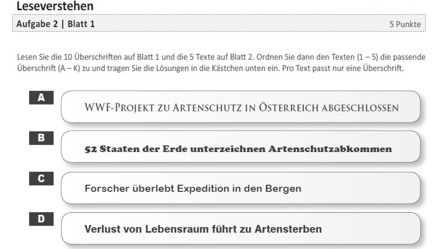 - Partea de "Schreiben" si cea de "Sprechen" nu se puncteaza, deoarece nu stim exact care sunt cerintele pentru fiecare nivel, mai ales de la B2 in sus. Eu voi posta tot testul, deci si scrisul si vorbitul, pentru a va face voi o idee despre ce presupune aceste teste, cine va dori o parere neoficiala, adica sa stie doar daca este formularea corecta, poate apela la colegele mele, dar repet, punctaje vor fi doar pentru citit si auzit.