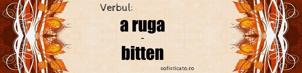 Conjugarea completă, tabelar, a verbului „bitten” (a ruga), la toate timpurile și toate persoanele, cu traducere în română.