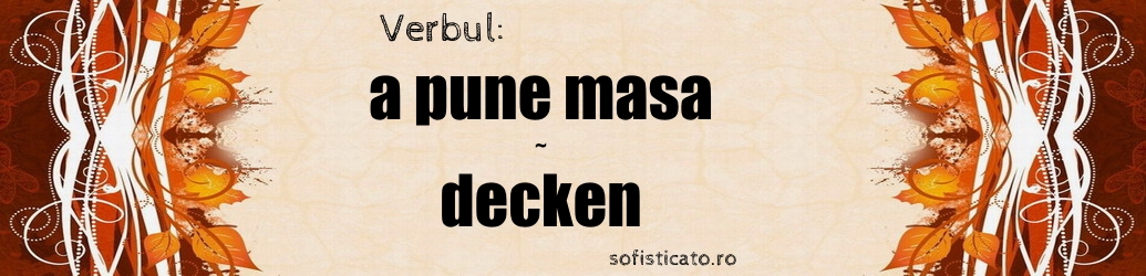 Verbul german decken are mai multe sensuri, iar unul dintre cele mai frecvente este a pune masa. Acest verb regulat este folosit atunci când vorbim despre aranjarea tacâmurilor, farfuriilor și a celorlalte obiecte necesare pentru masă. În mod obișnuit, expresia „den Tisch decken” înseamnă „a pune masa”. Cunoașterea verbului decken este utilă în descrierea activităților casnice și în situații cotidiene legate de pregătirea mesei, fiind echivalentul expresiei românești a pune masa.