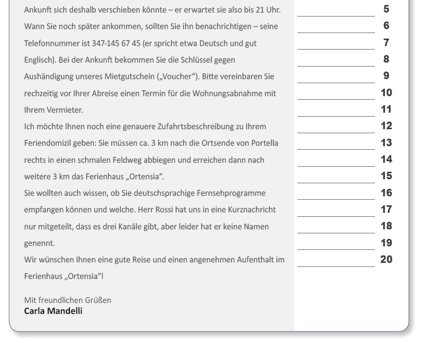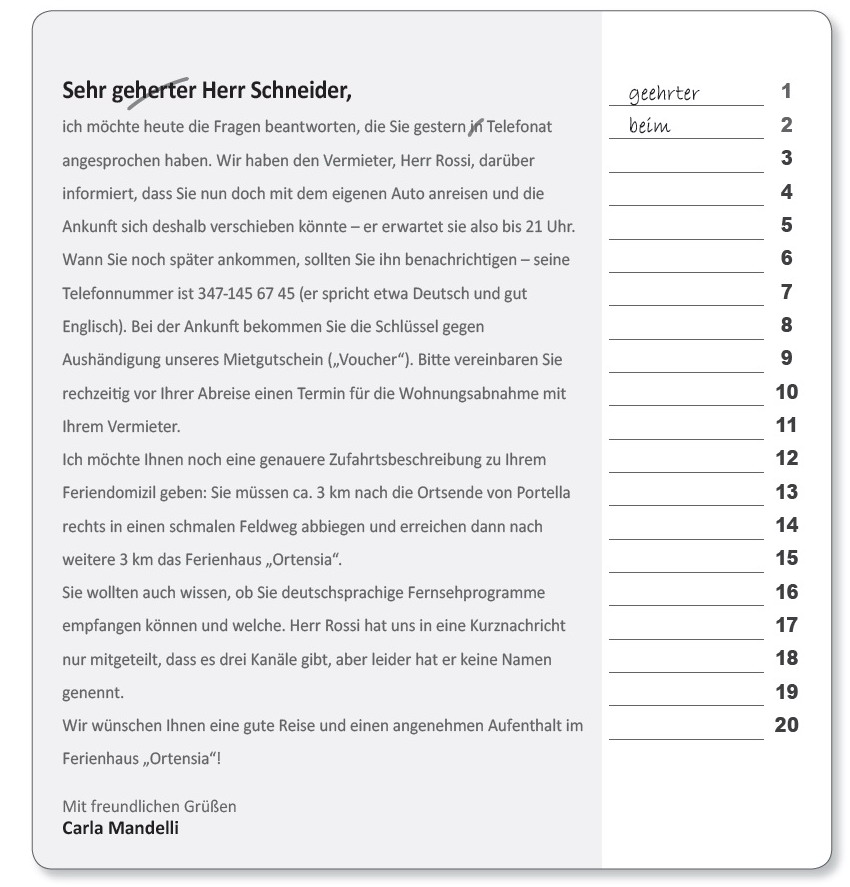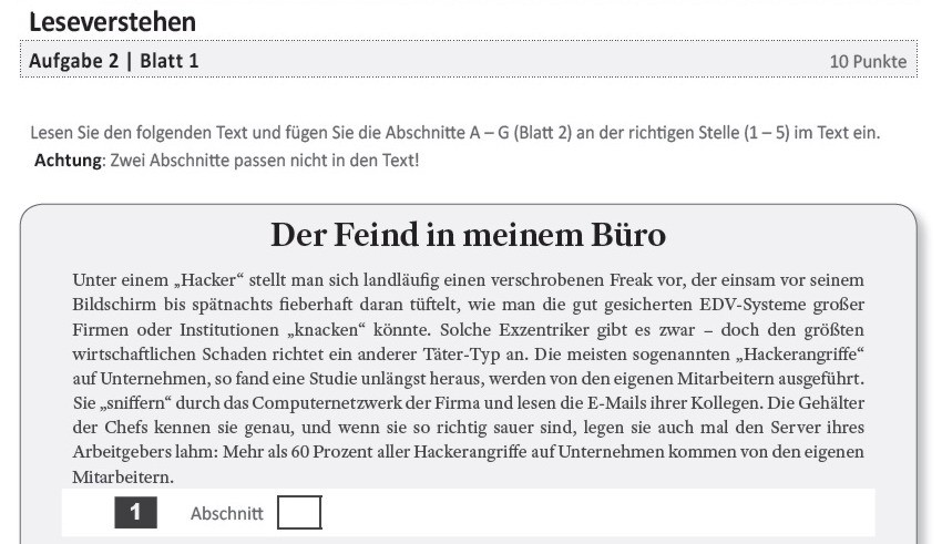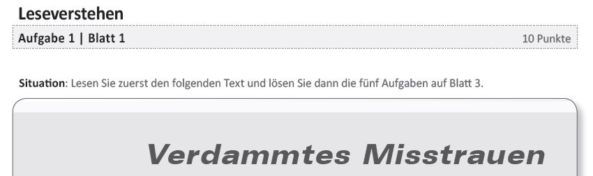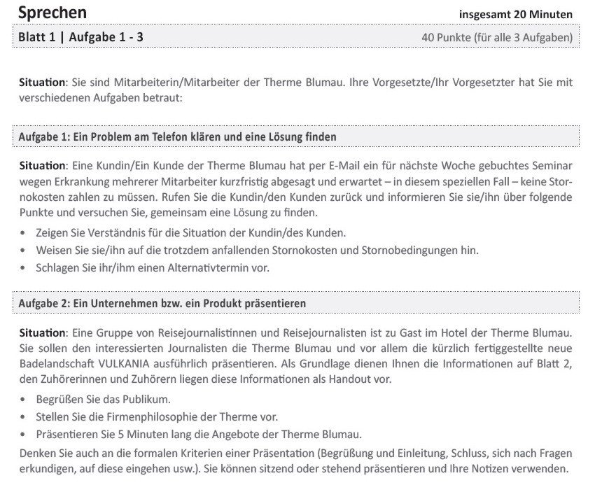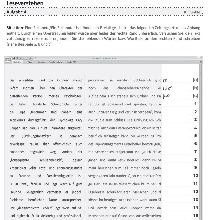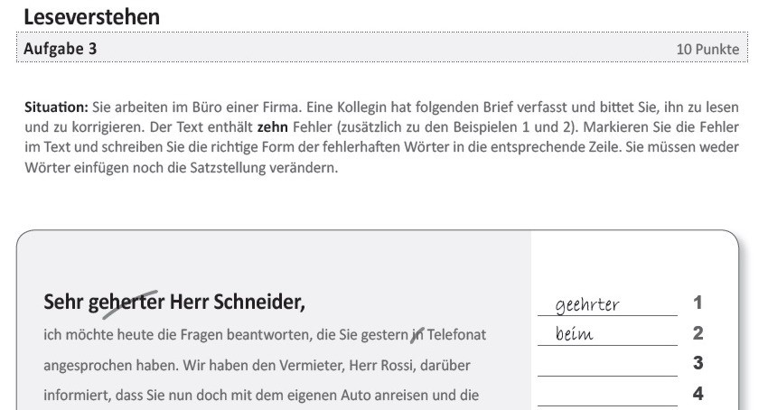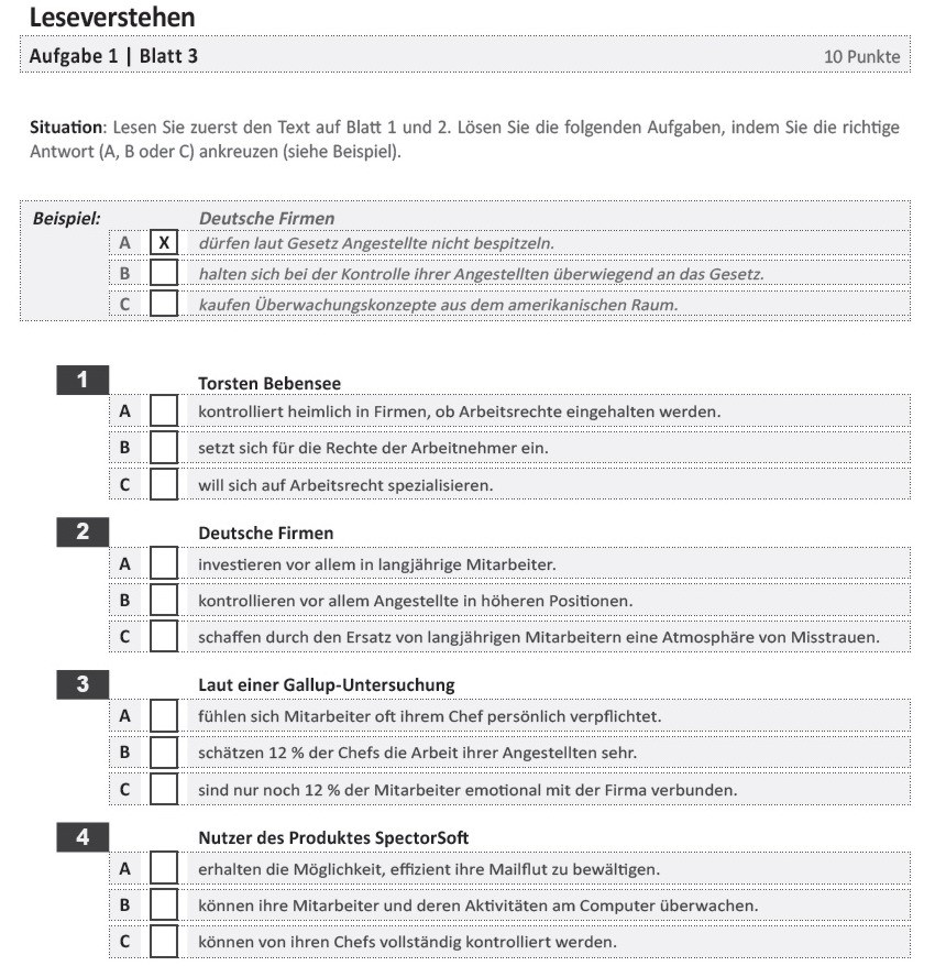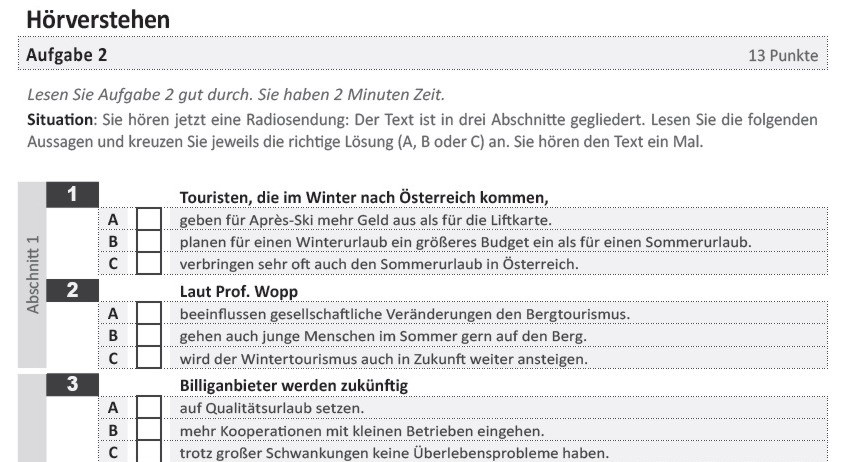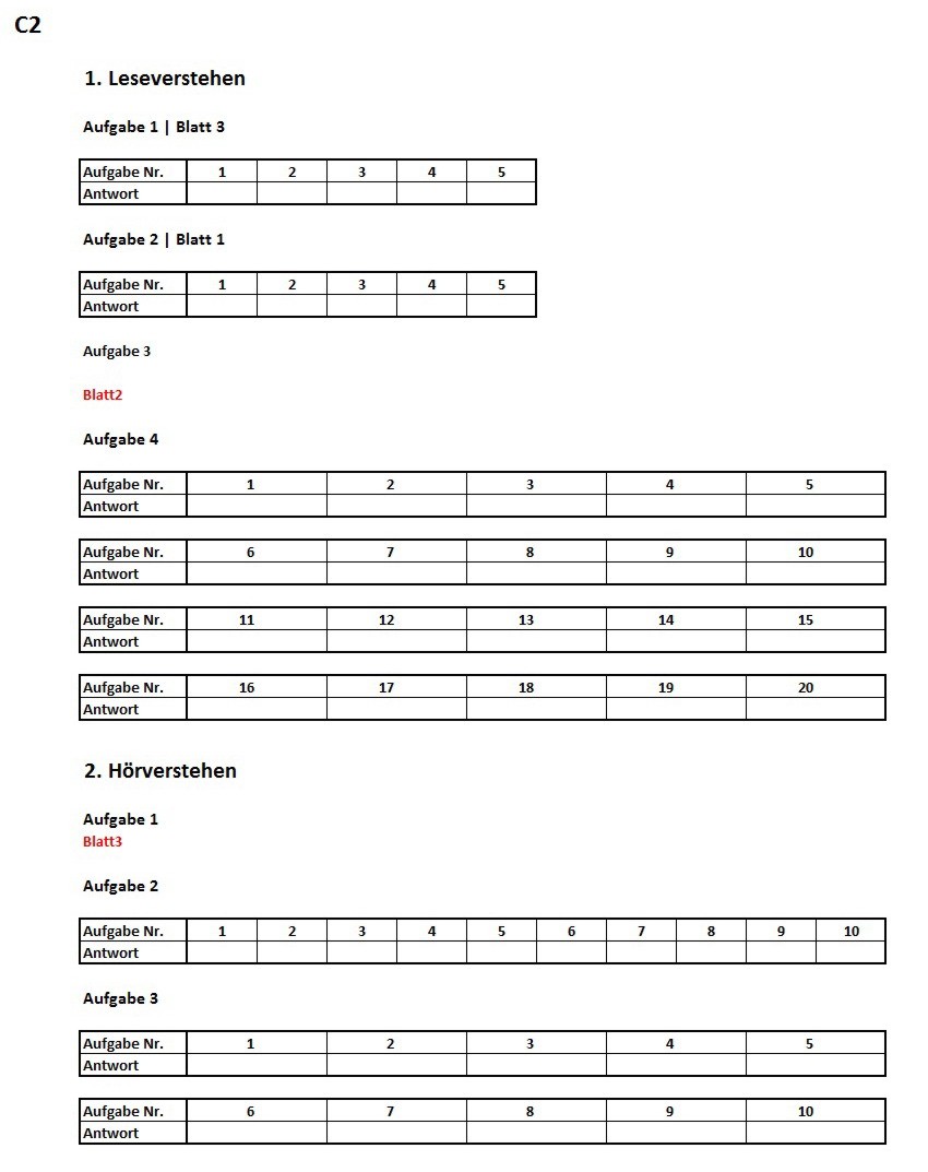 - Partea de "Schreiben" si cea de "Sprechen" nu se puncteaza, deoarece nu stim exact care sunt cerintele pentru fiecare nivel, mai ales de la B2 in sus. Eu voi posta tot testul, deci si scrisul si vorbitul, pentru a va face voi o idee despre ce presupune aceste teste, cine va dori o parere neoficiala, adica sa stie doar daca este formularea corecta, poate apela la colegele mele, dar repet, punctaje vor fi doar pentru citit si auzit.