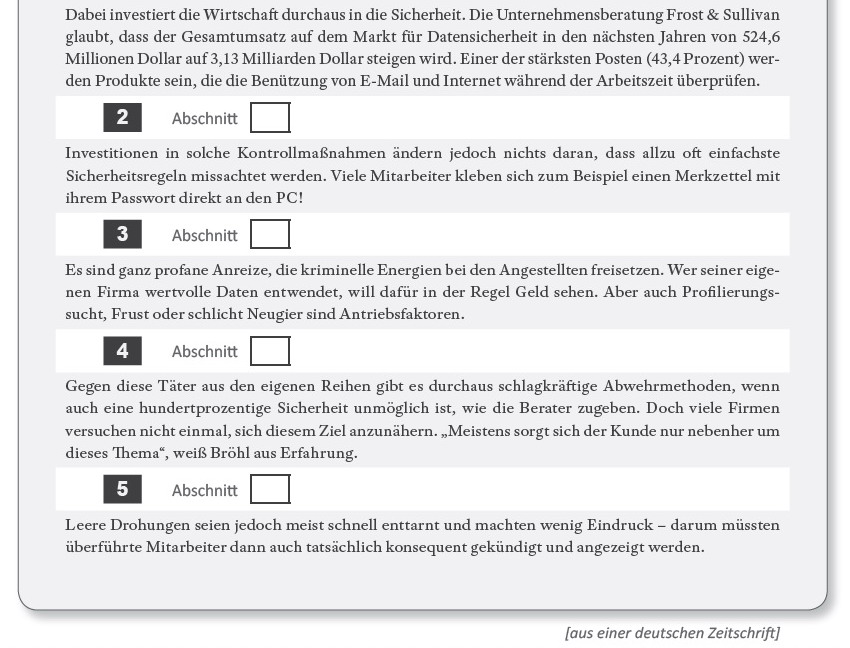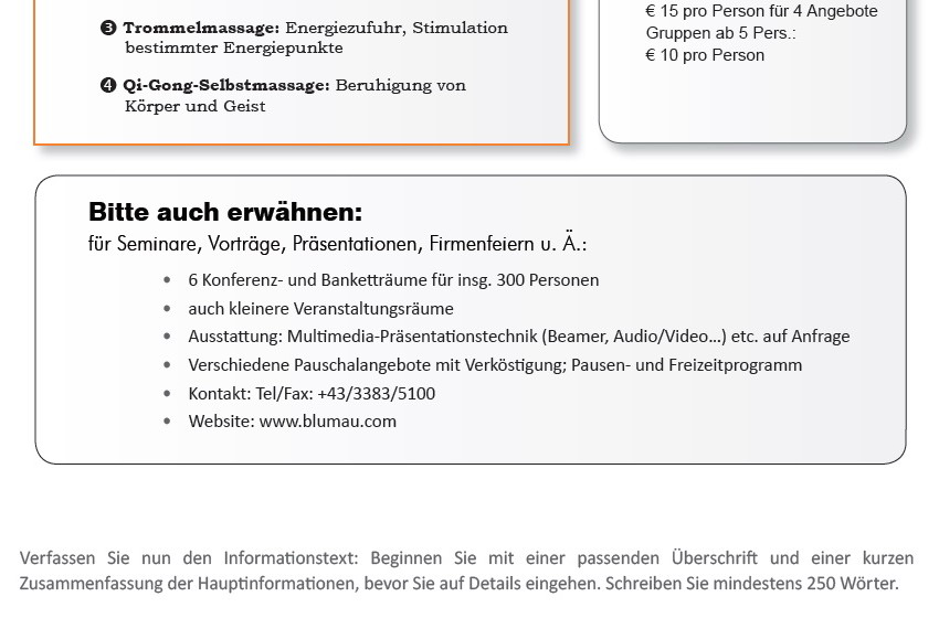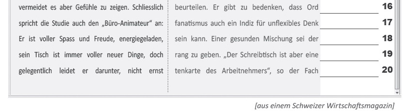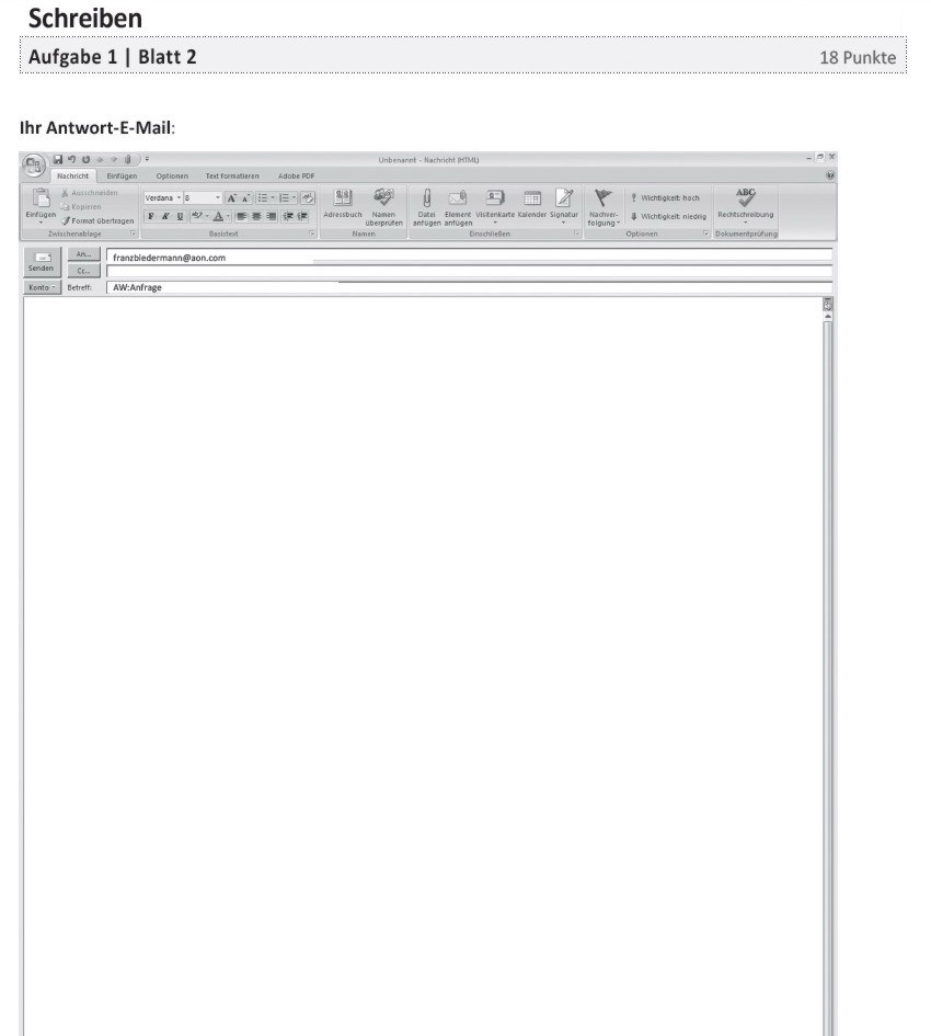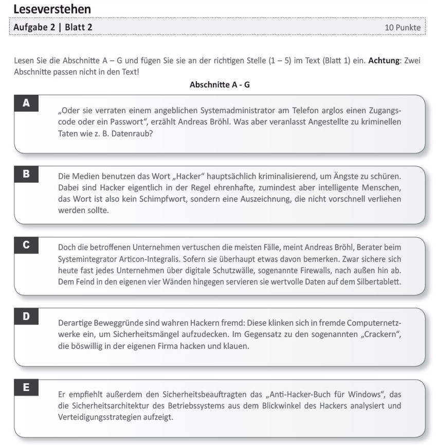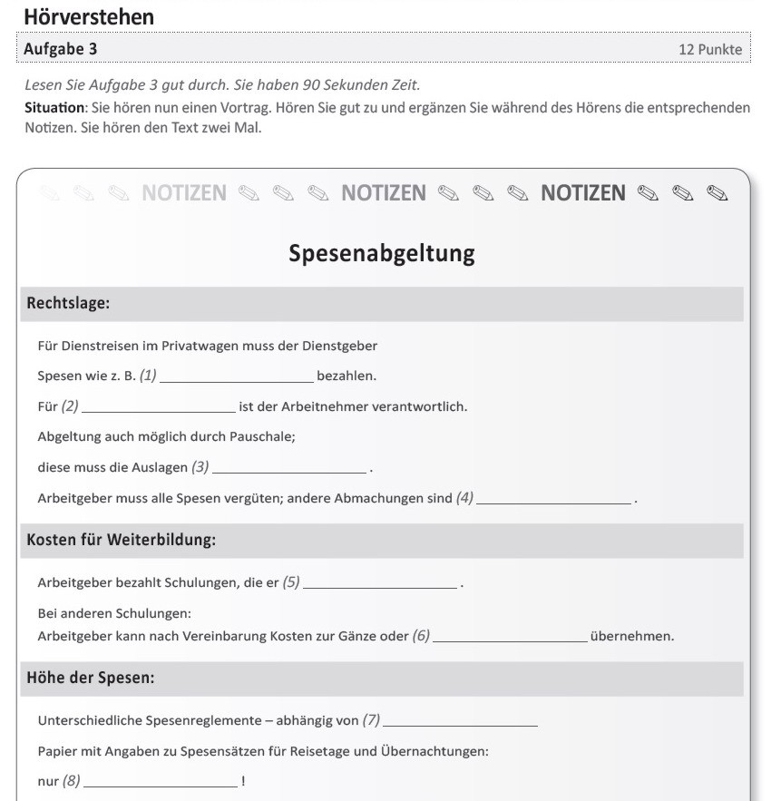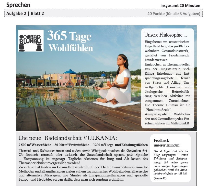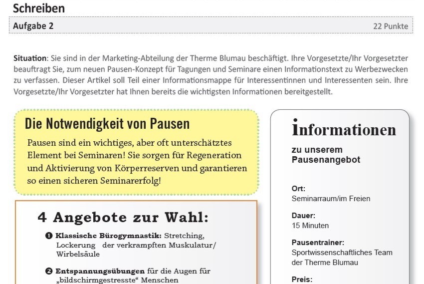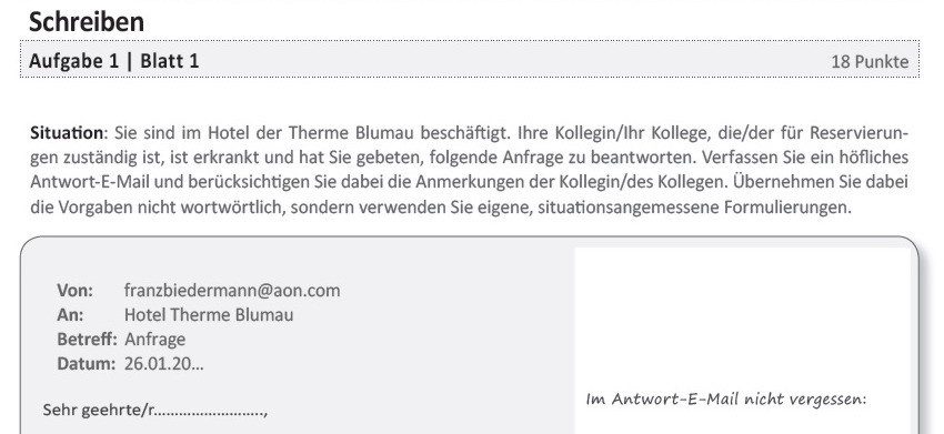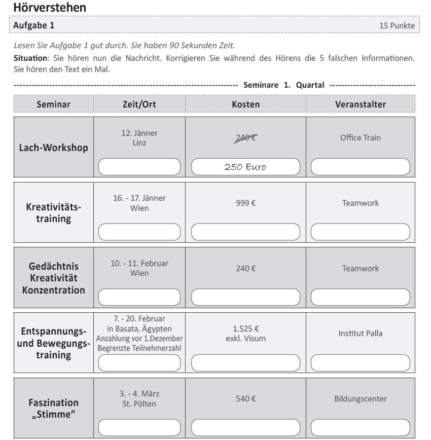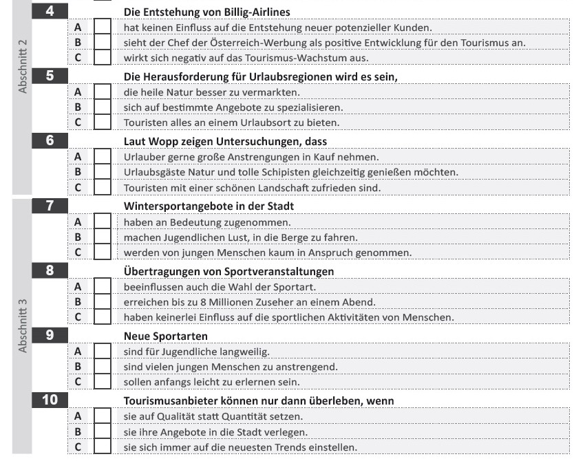 - Partea de "Schreiben" si cea de "Sprechen" nu se puncteaza, deoarece nu stim exact care sunt cerintele pentru fiecare nivel, mai ales de la B2 in sus. Eu voi posta tot testul, deci si scrisul si vorbitul, pentru a va face voi o idee despre ce presupune aceste teste, cine va dori o parere neoficiala, adica sa stie doar daca este formularea corecta, poate apela la colegele mele, dar repet, punctaje vor fi doar pentru citit si auzit.